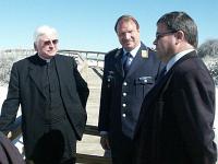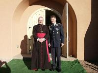 | | Oberst Wolfgang Fahl (m.) von Holloman AFB empfängt Gruppe, rechts Pastoralreferent Hubert Münchmeyer | Es bleibt nicht nur bei Briefings. Militärbischof Mixa besucht die Deutsche Schule am Standort, spricht und lacht mit den Kindern, sucht das Gespräch mit den Soldaten an deren Arbeitsplatz. Selbst die Einweisung ins Cockpit eines Tornados (der hier mit nationaler Beflaggung fliegt, wohingegen die Phantom amerikanische Hoheitsabzeichen trägt) ist für den Bischof von großem Interesse. Im Vordergrund des Besuchs freilich steht die Seelsorge, das Spenden des Sakraments der Firmung in der neu erbauten Johannes-Kirche in Alamogordo: einem sakralen Schmuckstück im Adobe-Stil, das evangelischen wie katholischen Christen als Gotteshaus dient. Die feierliche Übergabe und Einweihung hatten am 12. Januar 2003 der Leiter des Katholischen Militärbischofsamtes, Militärgeneralvikar Prälat Walter Wakenhut, sowie der Leiter des Evangelischen Kirchenamtes für die Deutsche Bundeswehr, Militärgeneraldekan Erhard Knauer, vorgenommen. Finanziert wurde das Gotteshaus zu je einem Drittel vom Katholischen und Evangelischen Militärbischof und vom Bundesministerium der Verteidigung. Das Grundstück für Kirche und Gemeindehaus hatte der Amerikaner Charles J. Dugan den Kirchengemeinden geschenkt.