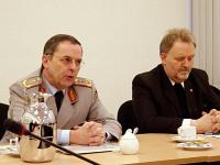 | | Generalinspekteur Wolfgang Schneiderhan (l.) mit dem Leitenden Wiss. Direktor i.K. Harald Oberhem (KMBA) | Daneben interessierten sich die Militärgeistlichen und Pastoralreferenten und –referentinnen unter anderem für Fragen der Inneren Führung und deren Umsetzung in der Praxis, für die Versorgungssicherheit gerade derjenigen, die im Einsatz ihr Leben oder ihre Gesundheit lassen mussten sowie für den Stand der Bundeswehrreformen. Auch wenn hier noch nachgesteuert werden müsse, so der Generalinspekteur, werde sich am grundlegenden Reformwillen und –bedarf nichts ändern. Details lassen sich im derzeitigen Stadium noch nicht nennen. Er betonte jedoch auch, dass man reformbedingter „Verunsicherung nur mit Informationen entgegenhalten kann“. Für unaufgebbare Felder in der Grundausbildung gerade der jungen Wehrpflichtigen hält der Generalinspekteur unter anderem die Innere Führung und die Arbeit der Militärseelsorge.