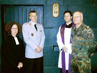 Der Gottesdienst für die Soldaten des Standortes stand unter dem Thema „Passion Christi – Weg des Menschen“ und integrierte als anschauliches Beispiel vom Leidensweg Jesu, ein Bild von Hans Memling, Szenen von der Passion Christi. Vor der Segnung der Heiligenfigur schlug Pfarrer Lehnert gedanklich eine Brücke von der Passion zum Leben der Hl. Barbara und dem Fürsprache-Charakter der Patronin. „Wann immer die Menschen, beim Eintritt in das Kirchengebäude, sich mit Weihwasser bekreuzigen, soll ihnen die Gestalt der Heiligen Barbara ins Gedächtnis rufen, wie uns der Glaube auch in den schlimmsten Fährnissen des Lebens stützen und stark machen kann“, erklärte Pfarrer Lehnert in seiner Predigt über den neuen Platz der Heiligenfigur.  |