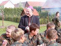Soldatengottesdienst mit Bischof Joachim WankeErfurter Bischof trifft sich mit in Thüringen stationierten Soldaten | | | Hüpstedt, 8.5.2003. Es ist eine schöne Tradition, dass Bischof Joachim Wanke einmal im Jahr die in Thüringen stationierten Soldaten der Bundeswehr zu einer gemeinsamen Messfeier einlädt. Diese fand in diesem Jahr Anfang Mai in Hüpstedt statt. Eigentlich sollte dieser Gottesdienst schon im vergangenen Jahr hier stattfinden, doch damals waren die Soldaten kurzfristig zum Hochwassereinsatz abkommandiert, so dass der Termin verschoben werden musste.