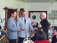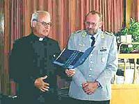 Laienapostolat in der MilitärseelsorgeStabsfeldwebel Wolfgang Altmann und Oberstleutnant Alfred Warner verabschiedet | | Militärdekan Peter Rafoth verabschiedet Stabsfeldwebel Wolfgang Altmann (r.) | Rendsburg, 06/2003. Anläßlich des religiösen Familienwochendes der Gemeinschaft Katholischer Soldaten im Bereich Küste mußte der Katholische Leitende Militärdekan Prälat Peter Rafoth, zwei engagierte Mitarbeiter verabschieden.