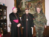 | | Besuch bei Kardinal Vinko Puljic (m.) in Sarajevo | Kardinal Puljic bangt um seine Katholiken. Von 500.000 Einwohnern gibt es nur noch 20.000 Katholiken in Sarajewo. Letztes Jahr sind wieder 500 Familien weggezogen. Das Land gibt nur noch denen Heimat, die ohnehin mit dem Leben abgeschlossen haben. Jeder weiß mittlerweile, wenn die SFOR-Soldaten abgezogen werden, gibt es erneut Krieg. Immer wieder hebt Mixa den Friedensdienst der sich im Einsatz befindenden Soldatinnen und Soldaten hervor. Er bittet die Soldaten sich gegenseitig anzunehmen und füreinander zu sorgen, damit die Durststrecken die jeder mal hat, besser überstanden werden können. Dass die Soldaten sich der Menschen dort annehmen, zeigt nicht zuletzt das CIMIC-Projekt „Lachen helfen“. Die Soldaten unterstützen mit zivilen Organisationen des Landes eine Armenküche und einen Kindergarten in Sarajewo. Was für glückliche, dankbare Gesichter als Bischof Mixa und die Soldaten im Kindergarten Kuscheltiere aus den Säcken hervorzaubern. Für jedes Kind ist ein Stofftier dabei, etwas zum lieb haben, gespendet von deutschen Kindern. Die Einrichtung ist geöffnet für alle Kinder, auch Behinderte, gleich welcher Religion oder Nationalität. Ein bemerkenswerter Versuch, Frieden und Versöhnung zu leben !!! Es regnet, als Militärbischof Mixa nach vier Tagen von Sarajewo in seine Heimat zurückfliegt. Bloß nicht aufgeben, ermutigt der Bischof. Auch wenn die Hoffnung noch so klein ist, „Lieben heißt, Leben weitergeben“.