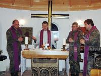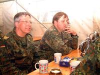 | | | Die beiden katholischen Militärgeistlichen Christian Preis (Feldlager Prizren) und Norbert Sauer (Prizren-Airfield) sind schon als Seelsorger sehr gefordert. Sie werden zu einem mit den Problemen der Bevölkerung, aber auch der Soldaten konfrontiert. Christian Preis ,der auch Kolping-Präses in Frankfurt ist, hat Kontakt aufgenommen zu Kolping im Kosovo. Er und einige Soldaten unterstützen ein Hilfsprojekt, durch das Familien im Kosovo eine Grundnahrungsversorgung erhalten. „Viele Soldaten wollen helfen, weil sie die Not der Bevölkerung mitbekommen.“, so Militärpfarrer Preis. Beide Geistliche laden jeden Sonntag die Soldaten zum Gottesdienst ein. Es sind nicht viele die kommen, aber diejenigen, die da sind, sind mit vollem Herzen dabei“, sagt Militärpfarrer Sauer. Norbert Sauer setzt sich intensiv dafür ein, dass die Soldaten auch außerhalb des Camps Land und Leute sowie deren Kultur kennen lernen. Beide Pfarrer sind innerhalb der Truppe anerkannt und sehr geschätzt. Einer der Soldaten bringt dies nach dem Gottesdienst zum Ausdruck: „ Militärseelsorge ist für uns wichtig.. Wir brauchen Menschen, die zuhören und helfen und uns in dieser schwierigen Situation hier im Kosovo durch ihr Dabei sein als Seelsorger Sinn stiften.“