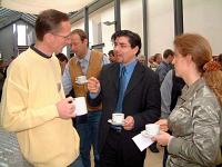 | | Peter Wendel (m.) vom ZFG im Gespräch mit Tagungsteilnehmern | Auch im Workshop "Mein Pfarrer ist im Einsatz" kam exemplarisch zum Ausdruck, welche Bedeutung dem Pfarrhelfer zukommt. Militärpfarrer Alfons Hutter aus Mittenwald, vom 27.12.02 bis 1.7.03 Seelsorger in Kabul (wo er auch seinen 50. Geburtstag "feierte"), würdigte die Zusammenarbeit mit seinem Pfarrhelfer Martin Mylius. In Kabul sei Hutter stets über das Geschehen am heimischen Standort informiert gewesen. Gegenseitiges Vertrauen sei dafür eine wichtige Voraussetzung. Dass die Zusammenarbeit der Katholischen Militärseelsorge mit dem Zentralinstitut für Ehe und Familie in der Gesellschaft (ZFG) ein Glücksfall ist, wurde in dem Vortrag des Diplomtheologen Peter Wendl zum Thema "Die Kooperation zwischen Militärseelsorge und ZFG zur Problematik der ,Fern-Beziehungen'" deutlich. Das ZFG ist eine interdisziplinäre Forschungseinrichtung der Katholischen Universität Eichstätt-Ingolstadt.
