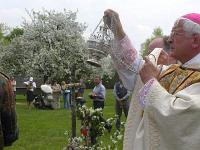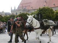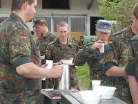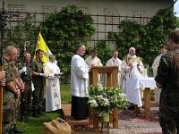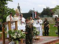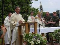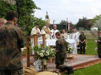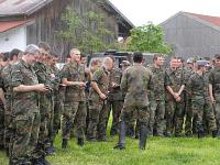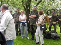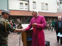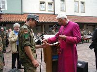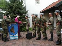 | | | Unter Führung von Oberfeldveterinär Dr. Wolfram Noreisch der seit 30 Jahren in Bad Reichenhall seinen Dienst tut, marschierten bei strahlendem Sonnenschein die Teilnehmer 60 km durch herrliche Landschaften am Waginger und Tachinger See entlang zum Zielort Altötting, darunter auch der Katholische Leitende Militärdekan aus München , Reinhold Bartmann , und ab dem zweiten Tag Militärgeneralvikar Walter Wakenhut, der eigens aus Berlin angereist war. Unter den Klängen des Luftwaffenmusikkorps aus Neubiberg zogen die Reiter und Fußpilger an der Gnadenkapelle vorbei, wo Militärbischof Walter Mixa aus Eichstätt die zwei- und vierbeinigen Pilger segnete. Anschließend feierte der Militärbischof mit den Militärpfarrern und Geistlichen aus Altötting im Garten des Franziskushauses einen Feldgottesdienst. Dr. Mixa ging in seiner Predigt auf den friedensschaffenden Dienst der Soldatinnen und Soldaten, besonders in den Krisengebieten unserer Welt ein. Er ermutigte alle Pilger Zeugnis ihres Christseins zu geben. "Ich habe keine Angst vor Andersgläubigen, aber vor laschen Christen", so der Bischof. Danach waren im Innenhof des Franziskushauses alle Teilnehmer zu einer Brotzeit eingeladen. Militärbischof Mixa ließ es sich nicht nehmen, jedem Soldaten persönlich einen geweihten Rosenkranz mit auf den Nachhauseweg zu geben.