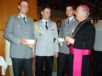 Feier des Weltfriedenstages in Augsburg | | | Augsburg, 05/2004. 700 Gottesdienstteilnehmer, darunter ca 600 Soldaten füllten Anfang Mai den Augsburger Dom anlässlich des Weltfriedenstages. Bischof Viktor Josef Dammertz feierte mit Geistlichen, darunter Militärgeneralvikar Walter Wakenhut, Berlin, Reinhold Bartmann, Katholischer Leitender Militärdekan für Bayern und Baden-Württemberg und Militärpfarrer Frank Schneider vom Standort Landsberg das Pontifikalamt unter dem diesjährigen Motto: „Zum Frieden erziehen“. Papst Johannes Paul II. rufe die Botschaft in Erinnerung, mit der er sich vor 25 Jahren an die Welt gewandt habe: „ Zum Frieden erziehen, um zum Frieden zu gelangen“, sagte der Bischof in seiner Predigt. Dies sei auch ein Appell an die „Großen“, an „die da oben“, an alle, die Verantwortung in der Politik, beim Militär, in der Gesellschaft, in der Wirtschaft trügen. Der Appell des Papstes stehe im krassen Gegensatz zum Prinzip, das Jahrhunderte, wenn nicht Jahrtausende hindurch die Planungen der Mächtigen dieser Welt bestimmt habe. Schon die Römer seien überzeugt gewesen : “Si vis pacem para bellum – Wenn du den Frieden willst, rüste für den Krieg !“Der Papst habe aber dieser Logik schon 1979 - noch mitten im „Kalten Krieg“- widersprochen und gelehrt: „ Wenn Du den Frieden willst, erziehe die Menschen zum Frieden!“ Und mit Waffengewalt sei dieses Ziel gewiss nicht zu erreichen. Dies mache der Konflikt im Irak sehr deutlich, betonte Bischof Dammertz.