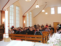 Mit dem "Psalm des Motorradfahrers" und den letzten Anweisungen der 22 Gruppenführer im Ohr, ging es dann tatsächlich auf den 230 Kilometre langen Rundkurs, der in liebevoller Kleinarbeit bereits Monate vorher ausgearbeitet worden war. Petrus war von dem Militärpfarrer ob seiner guten Verbindungen zu der höheren Etage bereits unterrichtet worden und wechselhaftes aber trockenes Wetter begleitete die Wallfahrer nach Marienheide. Dort angelangt war im evangelischen Rüstzeitheim der Mittagstisch gedeckt und nach kurzer Pause ging es dann im Motorrad-Korso zur Besichtigung der Wallfahrtskirche Marienheide. | | Beste Laune im ev. Rüstzeitheim | Über 200 Kilometer später und triefend nass traf man sich wieder in der Kaserne, wo man bei heißen Grillwürstchen den "Katholisch-evangelisch-ökomenisch-kulturell-wichtigen Tag" nochmals in geselligen Gesprächen erlebte. Oberstabsfeldwebel Joachim Müller und Hauptmann Uwe Thimm, beide Gruppenführer der Gruppe "1", waren sich einig: "Nächsten Februar geht es wieder los mit der Planung für die Wallfahrt 2005 - vielleicht wäre mal der Mai ganz gut."