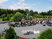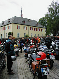 Bereits zum zweiten Mal nach 2003 hatte Pfarrer Küpper alle Soldaten, Mitarbeiterinnen und Mitarbeiter des Standorts Wahn zur Motorradwallfahrt geladen, die dieses Jahr nach Marienheide führen sollte. "Die Idee wurde geboren, als ich mich kurz vor meinem Auslandseinsatz von möglichst Vielen hier in Wahn verabschieden wollte", so der katholische Militärseelsorger Küpper. Schon im vergangenen Jahr nahmen 120 Motorradfahrer an der Wallfahrt teil, die zum Kloster Himmeroth in die Eifel führte. | | Die gute Verbindung zu Petrus war nur für den Hinweg gedacht | Mehr als 130 Motorradfahrerinnen und -fahrer waren dem diesjährigen Aufruf gefolgt und hatten die Maschinen so richtig poliert, um an der Wallfahrt nach Marienheide teilzunehmen. Einige mussten sogar auf eine Warteliste gesetzt werden, da die Resonanz wieder sehr groß war. Auch bis nach Berlin zu dem Verteidigungsminister war der Ruf gedrungen. Terminnöte und letztendlich sein Krankenhausaufenthalt hielten den motorradbegeisterten Minister von der Teilnahme leider ab. | | Wallfahrtsort Marienheide | "Hi-tech - Racer" trafen auf "weiß-blaue Gemütlichkeiten", "Youngtimer" auf "Oldtimer" und auch die "Zwei-Zimmer, Küche, Bad" Fraktion, wie die großen Reisemaschinen liebevoll genannt werden, waren mit von der Partie. Glänzend und leise knisternd standen sie alle einträchtig Seite an Seite aufgereiht vor dem Gebäude der katholischen Militärseelsorge in der Kaserne. Die Fahrer und Beifahrer wurden währenddessen mit einer Morgenandacht in der Kapelle des Wahner Fliegerhorstes mit Gebeten und einigen Liedern auf die Wallfahrt eingestimmt.