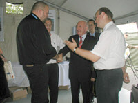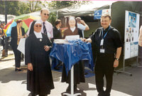 Tiefgreifende Gespräche behandelten die Sorgen um unsere Soldatinnen und Soldaten in der derzeitigen Einsatzgebieten, die Organisation der Militärseelsorge im Allgemeinen und manch neue Erkenntnis über die Militärseelsorger und ihre vielschichtigen Aufgaben in Deutschland im Besonderen. | | | Neben dem Generalinspekteur und seinem Vertreter genossen auch der Parlamentarische Staatssekretär Wagner und der Kommandeur des Standortkommandos Berlin, Herr Oberst Schulze mit seiner Gattin die ruhige und gepflegte Atmosphäre des vom BMVg etwas ungünstig platzierten Zeltes "in der zweiten Reihe". Trotzdem wurde das Zelt, in dem neben Obst auch Kaffee und Kaltgetränke bereit gehalten wurden, auf Grund entsprechender Hinweise und der engagierten Aktionen der beteiligten Militärseelsorger gut besucht. Als schließlich zum Erstaunen mancher Besucher noch die zwei im Gästehaus des KMBA tätigen Schwestern auftauchten, war die Attraktion der Militärseelsorge perfekt.