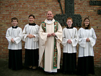 Wir erhöhen auf 17Messdieneraufnahme in Shape | | | Im Rahmen der sonntäglichen Eucharistiefeier in der Gemeinde beim Deutschen Katholischen Militärgeistlichen SHAPE / Belgien wurden die vier neuen Messdiener/innen Johannes Liebig, Theresa Kohlhaas, Markus Ruschil und Katharina Kohlhaas (im Bild von links nach rechts mit Militärpfarrer Georg Klar) in die große Ministrantenschar aufgenommen, so daß in SHAPE wieder 17 Mädchen und Jungen am Altar in der Kapelle des Pfarrzentrums Pater-Rupert-Mayer-Haus Dienst tun.
