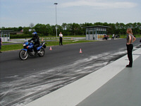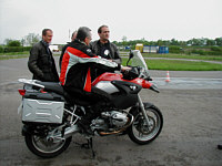 | | Richtiges Bremsen will gelernt werden. Foto: Herbert Albring | Die Gruppen setzten sich aus Teilnehmern zusammen wie sie unterschiedlicher nicht sein konnten. Wie im richtigen Leben war der "Chopper-Rider" neben dem "Cruiser-Kapitän", "Yoghurtbecher-Piloten", oder "dem Rennsemmel-Treiber" genau so vertreten wie der "Normalo" und "Genussfahrer" . Für alle jedoch hatte Trainer Frank Palmen einen individuellen Tipp, ein offenes Ohr für Fragen und jede Menge Hintergrundwissen zu bieten. So wurde nicht nur über Kreiselkräfte, Geschwindigkeit, Masse, Kurvengeschwindigkeit, Lenkimpulstechnik und Verlust-Grundzeit philosophiert, sondern vieles wurde mit dem eigenen Motorrad "erfahren".