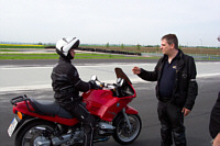 | | Tipps von Instruktor Frank Kuczinski (re). Foto: Peter Preuschat | Was jedoch mit dem "gefahrlosen Erkennen von fahrphysikalischen Zusammenhängen und Grenzbereichen" gemeint war, trieb dem Ein oder Anderem doch schon den Schweiß unter das Visier. Denn wann wird man schon einmal aufgefordert, auf dem Motorrad im Damensitz zu sitzen, ein Bein hinter sich auf den Soziussitz abzulegen oder gar auf der Sitzbank zu knien und das Ganze auch noch während der Fahrt auf einem Slalom-parcours? Aber auch das Herantasten an Bremskräfte und sichere Ausweichen vor Hindernissen sowie das "Legen-drücken-hängen" beim Kurvenfahren wurde praktisch "erfahren" und erhöhte so unmerklich aber effektiv eine bessere Fahrzeugbeherrschung.