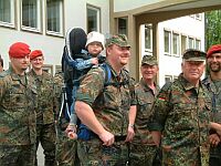 3. Internationale Pferde Wallfahrt nach AltöttingNeben Soldaten der Gebirgsjägerbrigade 23 aus Bad Reichenhall, Bischofswiesen, Brannenburg, Mittenwald und Füssen waren auch Kameraden aus Österreich, Frankreich und der Schweiz mit ihren Reitpferden und Tragtieren dabei. Durch die bevorstehende Verlegung der Soldaten der Gebirgsjägerbrigade 23 in den Einsatz fiel die Teilnehmerzahl in diesem Jahr geringer aus. Militärpfarrer Martin Straßer aus Bad Reichenhall, Oberst Heinz-Joachim Neumann, Stellvertretender Brigadekommandeur, begleiteten die Soldaten nach Altötting, ebenso wie Oberfeldveterinär Franz von Rennenkampff, Chef der Gebirgstragtierkompanie 230. | | | Die Wallfahrt begann mit einer Andacht in der General-Konrad-Kaserne. Im Anschluss verlegten alle mit Fahrzeugen nach Höglwörth, von wo aus die Wallfahrer zu Fuß und zu Pferd zum nordende des Waginger Sees nach St. Coloman marschierten. Am Seehof in Petting wurde zur Mittagszeit ebenfalls eine kurze Andacht gehalten. Abends machten alle in der Reiterhalle Rast. Sowohl Mensch wie Tier übernachtete dort. Am nächsten Tag setzte der Wallfahrerzug seinen Weg von Zaiselham nach Baumgarten in der Nähe von Kastl über Pfeffersöd nahe Tyrlaching fort. Am Mittwochmorgen mar-schierte die Gruppe unter Führung des Gebirgsmusikkorps aus Garmisch-Partenkirchen und zweier Polizeireiter nach Altötting, wo alle Wallfahrer und Tiere an der Gnadenkapelle von Militärgeneralvikar Walter Wakenhut gesegnet wurden. Am Franziskushaus trafen sich dann die Teilnehmer mit den Soldaten der Sternwallfahrt aus Regensburg, die von dem Katholischen Leitenden Militärdekan Reinhold Bartmann begleitet wurden. In der Basilika St. Anna zelebrierte Militärgeneralvikar Wakenhut zum Abschluss einen Gottesdienst. In seiner Predigt ging Wakenhut auf den schwindenden Einfluss der Kirche auf die Gesellschaft ein, auf den allgemeinen Werteverfall und auf die absehbare Minderheit der Christen in unserem Staat. Was die Kirche zu sagen habe und sagen müsse, das würde weniger gehört oder gar abgelehnt. Andererseits sei aber dem verstorbenen Papst in einer Art und Weise Ehre erbracht und dem neuen zugejubelt worden wie noch nie zuvor, sagte der Generalvikar. Aber genau zu diesen Menschen müssten die Christen gehen und das Wort Gottes verkünden. Der neue Papst, Benedikt XVI., mache Mut zum Glauben.
