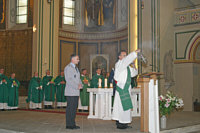 | | Pontifikalamt in der Peter-Paul-Kirche: Der Diakon inszensiert das Evangelienbuch |