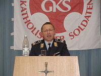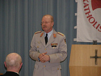 Generalmajor Wachter und Brigadegeneral Berthold Buchholz | "Streitkräftebasis - wichtiger denn je". "Das ist ein provokant formuliertes Thema", sagte Generalleutnant Hans-Heinrich Dieter, Stellvertretender Generalinspekteur der Bundeswehr und Inspekteur der Streitkräftebasis (SKB), "Es ist ein gutes Thema, denn Zukunft und Veränderung passen zum Neujahrsempfang." Damit war Generalleutnant Dieter, der mit seinem Vortrag im Mittelpunkt des Neujahrsempfanges der Gemeinschaft Katholischer Soldaten - Kreis Wahn (GKS) stand, auch gleich bei der Sache. Und zwar: Entstehung, Struktur, Aufgaben und Zukunft der SKB.