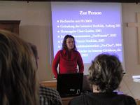 | | Beate Schöning während ihres Vortrages im Blockhaus Ahlhorn | Um dies zu untermauern, wurde eine Internetverbindung zu einem Chatroom aufgebaut und Beate Schöning führte den Eltern live im Chat die Praktiken dieser Erwachsenen vor, die sich teils als Kinder ausgeben. Schon nach fünf Minuten im Chat war die Verbindung zur pädophilen Szene aufgebaut und nach kurzer Zeit wird schnell klar, das von fünf "Gesprächspartnern" zwei gleich die Richtung einschlugen, die auf ein Treffen hinweisen bzw. sexuelle Praktiken abverlangten oder weitergeben wollten.