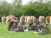 | | Soldaten während der Mittagspause in Pfeffersöd | Dazu gaben auch die täglichen Andachten an den Rast- und Ruheräumen die Möglichkeit. Diese wurden vom dem katholischen Standortpfarrer Martin Straßer mit Unterstützung von militärischen und zivilen Teilnehmern gestaltet und durchgeführt. Dabei wurde auch immer wieder die Verbindung zum Motto der Wallfahrt "Einer trage des anderen Last …" (Gal 6,2) hergestellt und darauf eingegangen. Besonders die Soldaten konnten diesem Motto viel für ihren Beruf entnehmen, da gerade sie immer bereit sein müssen, von Kameraden entsprechende Lasten (wie auch immer diese Aussehen mögen / privat und beruflich), zu übernehmen. Aber auch die Tragtiere des Einsatz- und Ausbildungszentrum für Gebirgstragtierwesen 230 sind ein ideales Bild für dieses Motto, da gerade sie dem Menschen mit der Abnahme von Lasten, eine enorme Stütze sind.