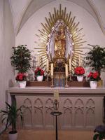 Motorradwallfahrt der Luftwaffenkaserne Köln Wahn | | Das Gnadenbild der Muttergottes mit dem Kind. Das Brot in der Hand weist auf eine alte Englporter Legende hin. | Auch wenn die vierte Motorrad-Wallfahrt 2006 am 1. Juni etwas feuchter ausgefallen war als geplant, so war sie dennoch nicht ins Wasser gefallen. Militärpfarrer Michael Berning griff erstmalig als katholischer Standortpfarrer in Köln-Wahn die Idee der bereits schon zur Tradition gewordenen Motorradwallfahrt auf. Sein Vorgänger im Amt, Pfarrer Georg Küpper, hatte vor einigen Jahren alle Motorradfahrer in Köln-Wahn zu einem ungewöhnlichen Kirchenbesuch, zum "Psalm des Motorradfahrers" in die Abtei Himmerod in der Eifel eingeladen. So trotzten dieses Jahr schon mittlerweile 150 "Treiber" mit ihren chromblitzenden Stahlrössern dem schlechten Wetter und versammelten sich in den frühen Morgenstunden in der Luftwaffenkaserne Wahn, um sich nach einer Einstimmung und der Segnung aller Motorräder auf einen 270 Kilometern langen Weg zu machen.