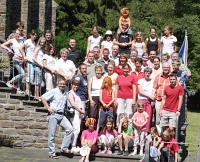 | | Gruppenbild: Abschiedsfoto am Sonntag nach dem Gottesdienst | Beim anschließenden Spielabend im Klosterhof stand der Fußball weiterhin im Vordergrund. Lioba Spreckelmeier hatte sich spannende Spiele mit und um den Ball ausgedacht und organisiert. Groß und Klein rannten und sprinteten mit der Kugel über den Hof, bis in den späten Abend hinein.