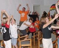 | | WM Jubel: Die Gemeinde jubelt über den Einzug der Nationalkicker ins Halbfinale | Nach dem Mittagessen ging es in einer Rallye wieder um das runde Leder. Die Mitarbeiter, Simon Spreckelmeier und Wiebke Mayer-Popien, hatten einen interessanten Parcour ausgearbeitet und organisiert. Auf sechs Stationen rund um das Kloster mussten die Gruppen ihr Wissen und ihr technischen Können unter Beweis stellen. Als Sieger wurde zum Abschluss die Gruppe der "WM-Zwerge" bei der Siegerehrung ausgezeichnet.