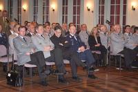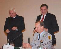 Verteidigungsminister Dr. Franz Josef Jung beim PolitikergesprächPolitikergespräch in der Julius-Leber Kaserne | | Blick in die Reihen mit Militärgeneralvikar Prälat Walter Wakenhut und dem Bundesvorsitzenden der GKS Oberstleutnant Paul Brochhagen und General Karl-Heinz Lather | Berlin, 09. November 2006. In Anwesenheit des Militärbischofs für die Deutsche Bundeswehr Dr. Walter Mixa und zahlreichen Soldatinnen und Soldaten sowie weiteren geladenen Persönlichkeiten aus Kirche, Politik und Gesellschaft nutze der Bundesminister der Verteidigung Dr. Franz Josef Jung anlässlich des traditionellen Politikergespräches die Gelegenheit, um grundsätzliche und aktuelle Überlegungen zur zukünftigen Sicherheits- und Verteidigungspolitik der derzeitigen Bundesregierung vorzutragen. Dabei stelle der Minister seine Rede in den zeitgeschichtlichen Kontext um den 09. November, den Dr. Jung als "Schicksalstag der Deutschen" würdigte. In insgesamt fünf sicherheitspolitischen Thesen ordnete der Bundesminister der Verteidigung die sicherheits- und verteidigungspolitischen Überlegungen für die Bundesrepublik Deutschland in das Weißbuch 2006 ein. Dabei hob er hervor, dass eine interessengeleitete Politik auch im Bereich der Sicherheit und Verteidigung von Werten geleitet werden muss, welche ihre Verankerung im Grundgesetz finden. Dr. Jung plädierte allerdings in diesem  | | Von links: Militärbischof Dr. Walter Mixa, Oberst Josef Blotz und Bundesverteidigungsminister Dr. Franz Josef Jung | Zusammenhang dafür, Werte und Interessen nicht im Sinne einer "Checkliste" abzuhandeln, denn über den Einsatz deutscher Streitkräfte entscheiden die Abgeordneten des Deutschen Bundestages. Mit Blick auf weitere Überlegungen sprach sich Bundesverteidigungsminister Dr. Jung dafür aus, in vernetzter Sicherheitspolitik als die gebotene Antwort auf komplexe Bedrohungslagen zu denken. In dem Zusammenhang nannte auf Nachfrage Dr. Jung einige Bedingungen, die erfüllt sein müssen, um im Rahmen einer Ausstiegsstrategie einen Einsatz deutscher Streitkräfte beenden zu können. Auf die Bedeutung der Militärseelsorge angesprochen, verwies Verteidigungsminister Dr. Jung auf den Wertebezug der Inneren Führung, welcher seit 50 Jahren auch durch das Engagement der Kirchen im Rahmen der Militärseelsorge auch heute noch seine Gültigkeit hat. Zum Abschluss des Gespräches überreichte Militärbischof Dr. Walter Mixa ein Faksimile eines Soldatengebetsbuches, welches am 31. Juli 1965 anlässlich der Inkraftsetzung der neuen Statuten für die katholische Seelsorge in der Deutschen Bundeswehr als Gedenkgabe herausgegeben worden ist.