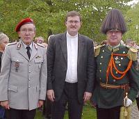 5. Internationale Reservistenwallfahrt nach Wigratzbad | | (v.l.) Oberstleutnant d.R. Jürgen W. Toschka, Georg Guggemos, Katholischer Standortpfarrer Landsberg/Lech und Anton Huber, Dirigent der Bürgerwehr Waldburg | Landsberg, 10.2006. Der Auftrag der Soldaten ist es, den Frieden zu erhalten und zu sichern. Gerade in unseren Tagen ist diese Aufgabe im Blick auf Afghanistan, Kongo und den Nahen Osten schwierig und riskant. Deshalb kamen die Soldaten zur Gebetsstätte und erbaten der Segen Gottes und den Schutz Mariens. Der Aufmarsch der Soldaten war imposant, die Kommandos, die Disziplin der Truppe und nicht zuletzt die verschiedenen farbigen Uniformen, die zusammen ein prächtiges Bild ergaben. Die Gläubigen und die Zuschauer waren beeindruckt. Beim Festgottesdienst in der Wallfahrtskirche erinnerte Standortseelsorger Georg Guggemos aus Landsberg an die große Aufgabe der Friedenssicherung und bat die Anwesenden um das Gebet für die Soldaten und ihre Familien.  |