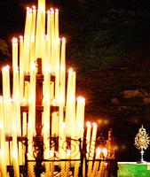 |  | | Die brennenden Kerzen an der Marien-Grotte sollen die Gebete der Pilger symbolisieren |