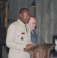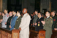 I | | Fürbitten während der Heiligen Messe werden von Soldaten unterschiedlicher Nationen vorgetragen | n einem Grußwort beim anschließenden Empfang im Kölner Maternushaus erinnerte Bundesverteidigungsminister Dr. Jung an die an Deutschland ergangene EU - Ratspräsidentschaft, in der mithin das Ziel verfolgt werden soll, die Europaidee neu zu beleben und vor allem den Verfassungsprozess voranzubringen. In diesem Zusammenhang dankte Minister Dr. Jung allen Militärgeistlichen für ihren Dienst in den Streitkräften und forderte die Diözesen auf, Geistliche dazu zu ermutigen, unter den Soldaten zu dienen. Militärgeneralvikar Prälat Walter Wakenhut überbrachte die besten Wünsche des Katholischen Militärbischofs für die Deutsche Bundeswehr, Bischof Dr. Walter Mixa (Augsburg).
