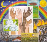 In der Mitte des Hungertuches sind eine Friedenstaube sowie flehende und hilfesuchende Hände zu sehen.