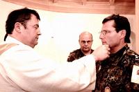 Über neun Wochen hatten sich beide bei der wöchentlichen Schafkopfrunde auch menschlich näher kennen lernen dürfen. Spiel, Humor und Glaube müssen keine Gegensätze sein, sondern dürften sich gegenseitig ergänzen, so predigte der Militärgeistliche. Weitere Bilder | | Bezeichnung mit Chrisam-Öl bei der Hl. Firmung |