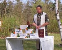 Militärdekan Stahlhacke (Militärpfarramt Munster) zelebrierte den Feldgottesdienst zum Thema Angst, Traurigkeit, Einsamkeit, Ehrgeiz und Stress und Schuld. Mit Hilfe von Steinen und Rosen verdeutlichte und verinnerlichte Militärdekan Stahlhacke sehr eindrucksvoll für jeden Soldaten die einzelnen Themen und jeder einzelne Teilnehmer nahm für sich aus seiner Predigt das für ihn Wichtige auf den Weg.