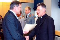 | Verteidigungsminister Dr. Franz Josef Jung überreicht Militärgeneralvikar Walter Wakenhut die Anerkennungsurkunde Foto: Torsten Rütters, BMVg | 1997 kehrte er für kurze Zeit nach Bayern zurück, als Wehrbereichsdekan VI in München. 2000 berief ihn Militärbischof Dr. Mixa zu seinem Generalvikar und damit zum Leiter der Kurie nach Berlin.