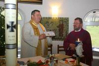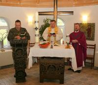 "Gaudete-Sonntag" im Feldlager Prizren | | Militärpfarrer Lehner überreicht P. Happel die Spende für das Loyola-Gymnasium | Prizren / Kosovo, 15.12.2008. Vor über 60 Soldaten predigte am 3. Adventssonntag ("Gaudete" = "Freut euch!") der Direktor des Loyola-Gymnasiums, Prizren, in beeindruckender Weise über die christliche Freude, die schon der Apostel Paulus im Brief an die Thessalonicher verkündet, wenn er sagt: "Freut euch zu jeder Zeit!"