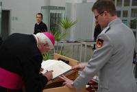 "Gesellschaft und Bundeswehr - Parallele Welten?"Zuhören, vortragen, diskutieren: Militärbischof Mixa zu Gast am Zentrum Innere Führung | | Bischof Dr. Mixa trägt sich in das Gästebuch des Zentrums ein, neben ihm Begleitoffizier Hauptmann Andreas Leis | Koblenz, 11.02.2009. Bereits zum vierten Mal in seiner Amtszeit als Katholischer Militärbischof für die Deutsche Bundeswehr besuchte Dr. Walter Mixa, Bischof von Augsburg, diese in der Bundeswehr einmalige Einrichtung und stand zum Gespräch bereit. Mit seinem erneuten Aufenthalt in der bedeutenden Garnisonsstadt würdigte er sowohl die inzwischen bewährte Führungskultur der Bundeswehr als auch die ethische Ausrichtung dieser Ausbildungsstätte.