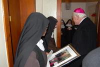 Neben den offiziellen Terminen in der Bundeswehr-Einrichtung feierte Bischof Dr. Walter Mixa auch eine festliche Heilige Messe im Kloster Bethlehem der Klarissen in Koblenz-Pfaffendorf. Der jungen Äbtissin Sr. M. Martina aus Südafrika und der Altäbtissin überreichte er ein Foto und segnete den ganzen Konvent, der sich seit über 100 Jahren der Anbetung widmet und in dessen Nähe die Kasernen liegen.