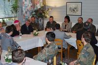 | | | Der Kommandeur des Panzerbataillon 104, Oberstleutnant André-Michael Abed, informierte in einem Lagevortrag den Militärbischof über den struktursicheren und enorm einsatzerfahrenen Verband, der mit bestmöglicher Integration, ohne Nachwuchsprobleme und mit dem weltweit modernsten Waffensystem, dem Leopard 2A6, den militärischen Auftrag erfüllen kann. Mit Blick auf die Konfessionen der im Panzerbataillon 104 in Pfreimd dienenden Soldatinnen und Soldaten wurde berichtet, dass 453 konfessionell gebunden sind und 235 keiner Konfession angehören, was für die Militärseelsorge und den Lebenskundlichen Unterricht (LKU) gerade in der Neukonzeption als verpflichtender Ethikunterricht eine große Herausforderung ist. Besondere Erwähnung fand das Engagement des Pastoralreferenten Helmut Brandl, den er als "einen Meister seines Handwerkes" lobte.