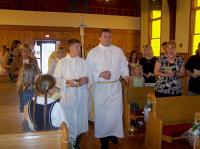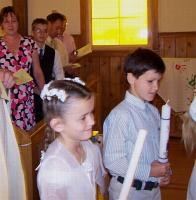 Hatten bei der Taufe üblicherweise Eltern und Paten stellvertretend für ihr Kind dem Bösen abgesagt und ihren Glauben an Gott bekannt, so haben die neunjährige Melissa und der ebenfalls neunjährige Johann dies jetzt erstmalig selber am 03. Mai 2009 vor der Gemeinde getan, ihre Kommunionkerzen in den Händen haltend. Kleine Taschenrosenkränze und Kreuze der Militärseelsorge übereichte Pater Simeon den Kindern als Andenken an ihre Erstkommunion. Bei den Damen Rita Moreno, Agnes Merten, Martina Vogel, Nicole Eich und Marie Kölzer und allen anderen Beteiligten bedankte sich der Standortpfarrer für ihren Einsatz bei der Vorbereitung und Durchführung der Feier.