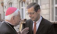 Robbe: Kirchen sollten an einem Sonntag für Soldaten beten | Militärbischof Dr. Mixa(l.) und Wehrbeauftragter Robbe Foto: Josef König | Berlin (KNA). Der Wehrbeauftragte des Bundestages, Reinhold Robbe, hat mehr Aufgeschlossenheit der Gesellschaft für die Bundeswehr angemahnt. Dabei regte Robbe auch ein verstärktes kirchliches Engagement an. So könne er sich vorstellen, dass in den Kirchen in Deutschland an einem Sonntag des Jahres ein einheitliches Gebet mit einem Segenswunsch für die im Einsatz befindlichen Soldaten gesprochen werde, sagte der Wehrbeauftragte in einem Gastkommentar der in Berlin erscheinenden Zeitschrift „Kompass“ (September). Dazu könnten die Kirchenleitungen in ökumenischer Eintracht einen Termin festlegen. Robbe verwies auf den Wunsch vieler Soldaten nach mehr gesellschaftlicher Anerkennung für ihren Dienst. Statt „freundlichem Desinteresse“ gehe es um mehr Anteilnahme,menschliche Zuwendung und mehr Verständnis für den "oft sehr schweren und gefährlichen Dienst" der Soldaten.