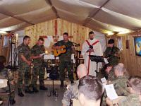 Taufe auf dem Airfield in Prizren | Im Taufgottesdienst von links: Taufpate und Täufling, evangelischer und katholischer Militärpfarrer, Musikerin Foto: © Gernhuber, Bundeswehr | Kosovo, 30.08.2009. Das Kirchenzelt im Feldlager Airfield war gut gefüllt, als Stabsunteroffizier Mario Richly die Erwachsenentaufe empfing. Der katholische Militärpfarrer Thomas Funke spendete sowohl die Taufe als auch die Firmung und gab dazu mehrere Erklärungen, damit die anwesenden Gäste dem schönen Ritus folgen konnten.