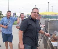 Die bewerte Crew am Grill: R-L, Hauptmann Stefan Eich, Oberleutnant Mario Frese, Oberstabsfeldwebel Bernhard Kölzer und im Vordergrund, Hauptfeldwebel Antonio Ribeiro da Rocha, hatten Bratwurst, Brisket und Bohnen auf den idealen heißen Punkt gebracht und zahlreiche Helfer sorgten an der Futterkrippe dafür, dass die Schäfchen der Gemeinden und ihre Hirten zügig verpflegt wurden.
