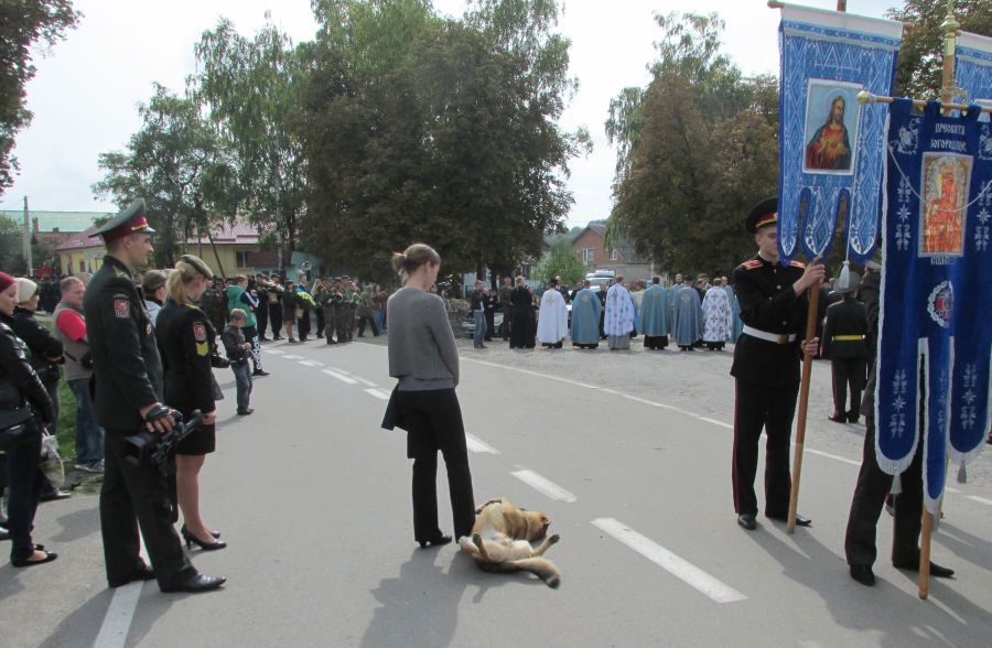 Aufstellung zur Prozession zur Kathedrale: Ein "Wallfahrtshund" lässt sich nicht beim Sonnen stören.