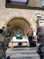 "Der Friede uns und Freude gibt, den Geist der Heiligkeit, der uns als seine Kirche liebt, ihr Einigkeit verleiht", sang die Gemeinde zur Eröffnung. Nach der Lesung aus dem Evangelium ging Pfarrer Preis in seiner Predigt darauf ein, dass in unserer Gesellschaft auch bei der geringsten Kleinigkeit sofort nach einem Schuldigen, einem Sündenbock, gesucht werde. Dies sei nicht mit dem christlichen Glauben zu vereinbaren. "Mit Sündenböcken ist bei Jesus Schluss", so der Militärgeistliche. Nach den Fürbitten besonders für die Soldaten, die im Einsatz ihr Leben riskieren, sang man zur Gabenbereitung "Suchen und fragen, hoffen und seh'n". Der Eucharistiefeier folgten das Danklied und das "Vater unser". Nach Segen und Entlassung lud Pfarrer Preis die Gemeinde zum gemütlichen Verweilen im Freien nach rheinhessischer Tradition bei "Weck, Worscht und Woi" (Brötchen, Wurst und Wein) ein.