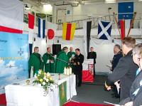 Im voll besetzten Hangar des Schiffes, der von der Besatzung zu einem würdigen Gottesdienstraum umgestaltet war, konnte der Leitende Militärdekan im Norden, Msgr. Rainer Schadt, nebem dem Kommandanten auch den amerikanischen Kommandeur BALTOPS, Konteradmiral Christensen, den Kommandeur der Einsatzflottille 1, Flottillenadmiral Brinkmann, und den Kommandeur des Sanitätskommandos 1, Generalarzt Dr. Pracht, sowie viele ehemalige Mitarbeiter der Katholischen Militärseelsorge begrüßen.