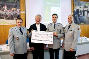 Katholische Soldaten schaffen berufliche Zukunft für traumatisierte Jugendliche in Georgien | Katholische Soldaten übergeben Spendenscheck für die Nachbarschaftshilfe (von links): Hauptmann Michael Grundmann, GKS-Vorsitzender Niedersachsen/Bremen, Pater Dietger Demuth, Hauptgeschäftsführer von RENOVABIS, Stabsfeldwebel Ralf Eisenhardt und Oberstabsfeldwebel Peter Weber, der Leiter des Sachausschusses "Soziales Engagement". Foto: © KMBA / Eggen | Der Katholikenrat beim Katholischen Militärbischof für die Deutsche Bundeswehr hat in der diesjährigen Vollversammlung beschlossen, die erfolgreiche Aktion „Nachbarschaftshilfe der katholischen Soldaten“ im Jahre 2009/2010 fortzusetzen. Die Aktion wird unter dem Leitgedanken „Eine berufliche Zukunft für traumatisierte Jugendliche in Georgien“ weitergeführt werden. Die aufgrund des bewaffneten Konfliktes im vorigen Jahr verschärfte sozial-ökonomische Lage in Georgien trifft vor allem Kinder und Jugendliche aus bedürftigen Familien. Sie haben kaum Aussicht auf eine berufliche Chance.