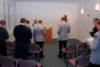 Noch recht neu ist die Möglichkeit, im Andachtsraum „St. Michael“ des Bundesministeriums der Verteidigung einmal im Monat freitags zu einem kurzen Gottesdienst zusammen zu kommen. Dieser schlichte Raum wurde vor gut zwei Jahren im Obergeschoss des Bendlerblocks eingerichtet, künstlerisch ausgestaltet und feierlich von den beiden Militärbischöfen seiner Bestimmung übergeben. Aus seinen Fenstern geht der Blick zur direkt angrenzenden „Gedenkstätte Deutscher Widerstand“ an der Stauffenbergstraße, wo im Ehrenhof der Widerstandskämpfer des 20. Juli 1944 gedacht wird, sowie zum Reichstagsgebäude. Auf Wunsch der Soldaten im Bendlerblock und der Mitarbeiter im Ministerium wird in Zukunft auch in der Nähe des Andachtsraums eine Begegnungsmöglichkeit beim kurzen Kirchkaffee bestehen. In der bevorstehenden Fastenzeit wird es wöchentliche Morgenandachten geben.